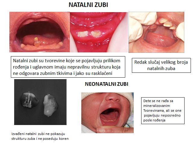Beba moze da se i rodi sa mineralizovanim tvorevinama kada se nazivaju NATALNI ZUBI.(slika). Pojava je retka i javlja se 1 slučaj na oko 2000 porođaja.