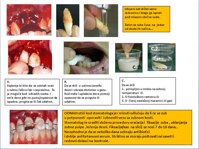 Kod izbijanja zuba neophodno je izbijeni zub sačuvati ili u vlažnoj maramici, ili u časi sa mlekom ili u samim ustima.