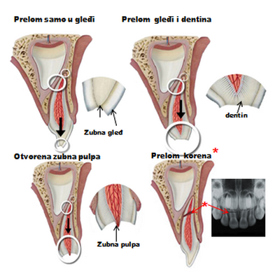 Na slici su shematski prikazani različiti oblici preloma zuba pri čemu nije došlo do pomeranja i oštećenja klice stalnog zuba ispod njih.