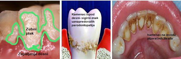 Zubni kamenac(kalkulus) predstavlja mineralizovani zubni plak. Uglavnom je nagomolava uz desni u prdelima oko izvoda velikih pljvačnih žlezda, a to su unutrašnje površine donjih sekutića(prema jeziku) i na spoljašnjim površinama (prema obrazu) gornjih bočnih zuba. Na površini kamenca se nalazi sveži, meki, zreo plak bogat bakterijama. Kamenac vrši mehanički pritisak na desni, a bakterije oslobađaju toksine i enzime što podstiče zapaljenje. Zapaljenje se sa desni može da širi na kost i korena zuba i posebno vlakna koja ih povezuju. To je mehanizam nastanka, drugog najzastupljenijeg oboljenja zuba- PARODONTOPATIJA (parodontalna oboljenja) koje se uglavnom javljaju u srednjem i starijem dobu i uzrokuju, ako se na vreme ne reaguju i ne leče, ispadanje zuba. Parodontopatije su kod dece, a posebno pre puberteta izuzetno retke i posledica su poremečaja opšteg ili lokalnog imuniteta. Ali zapaljenje desni je prisutno u svim uzrastima.