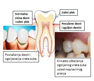 Ogoljavanje dentina u predelu vrata zuba može da se dogodi i usled zapaljenja desni i korišćenja tvrdih ili starih četkica i nepravilnih i grubih pokreta prilikom pranja zuba. Zapaljene i otečene desni su posebno osetljive. Preporučuju se meke ili ultra meka četkica (soft ili ultrasoft) koja se menja najduže posle mesec dana. Najbolje je da prvo stomatolog demonstrira i kontroliše pravilnu tehniku četkanja. Od električnih četkica najbolje su tzv 3D varijante koje ima kretnje u tri pravca.