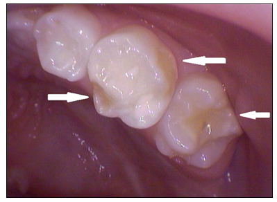 Razvojni defekti se razvijaju i na bočnim zubim i ponekad je i za stručnjaka teško da ih primeti.(slika 5.). Na ovakve defekte se često nadovezuje karijes.