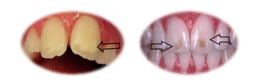 Vrlo je važno da se razlikuje karijes od razvojnog defekta. Karijes se pojavljuje kao bela mrlja na prethodno normalnoj gleđi i to pre svega uz ivicu desni. Rezvojni defekat je uglavnom na drugim površinama, gde se karijes ne javlja. (Slika 4. i 4b)