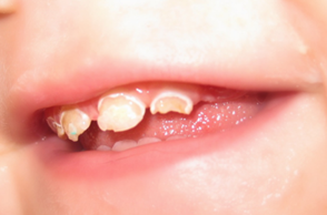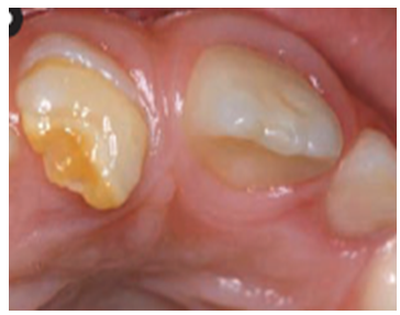 Stalni sekutići(desno) je povređen od strane mlečnog zuba u toku razvoja tako da je izostala izgradnja gleđi
